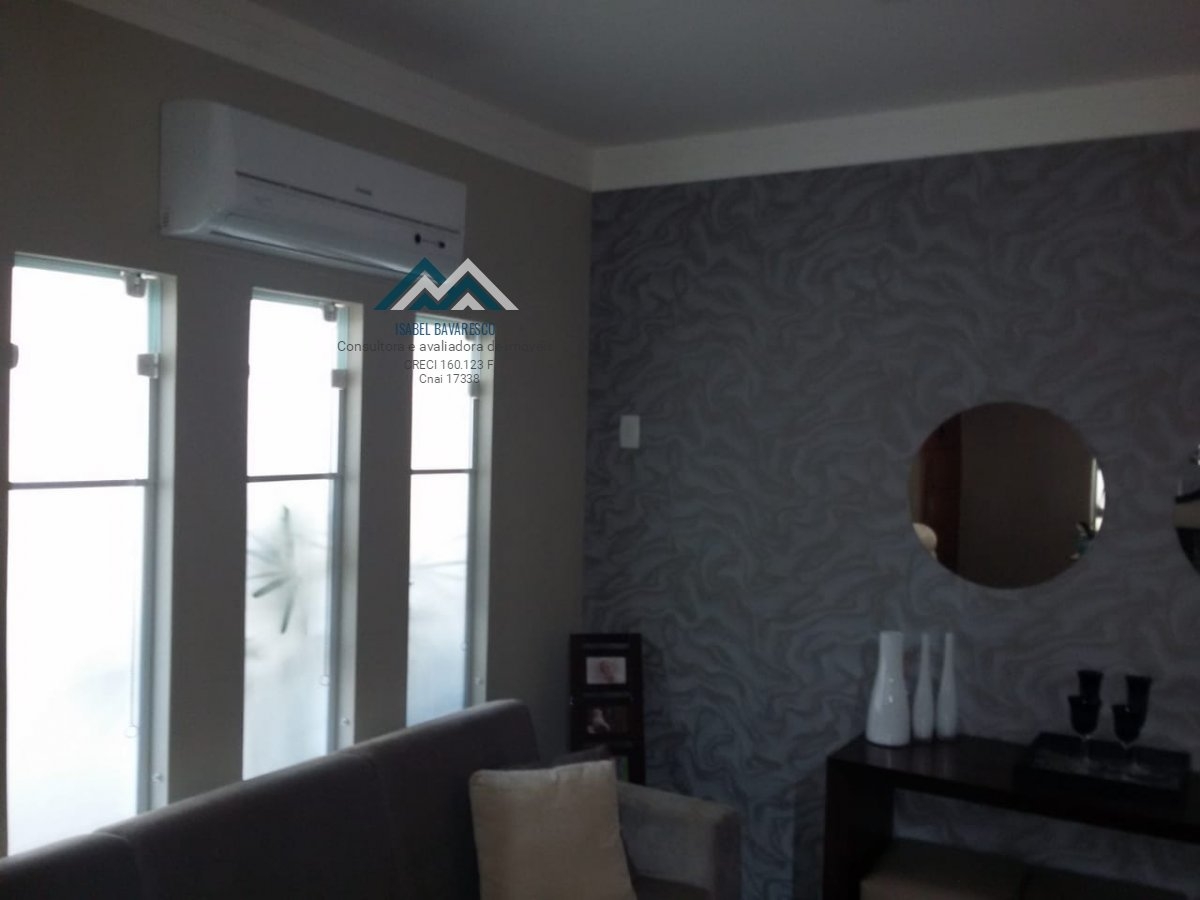 Sobrado com 120 m² de construção, pavimento térreo: sala dois ambientes com ar condicionado, lavabo, cozinha modulada com cooktop, forno elétrico, coifa, despensa fechada, área de serviço com armários modulados, área gourmet com armários, churrasqueira, cooktop, ventilador, balcão, piscina aquecida e iluminada com hidro, quarto na área externa com ventilador. No piso superior, 3 dormitórios sendo 1 suite, todos os dormitórios com ar condicionado, quarto revertido para escritório, rico em armários, banheiro social, porcelanato em todas as dependências., esquadrias e portas em alumínio.